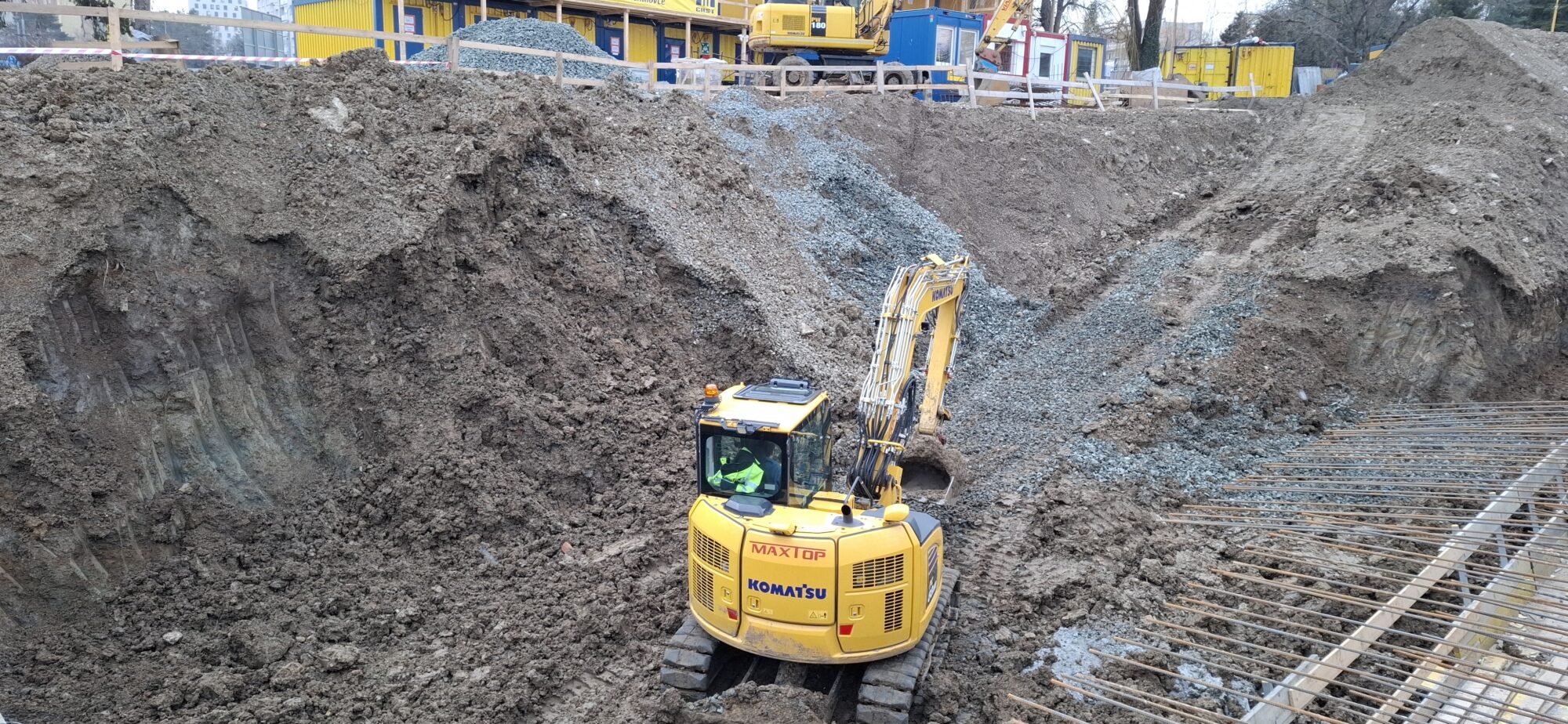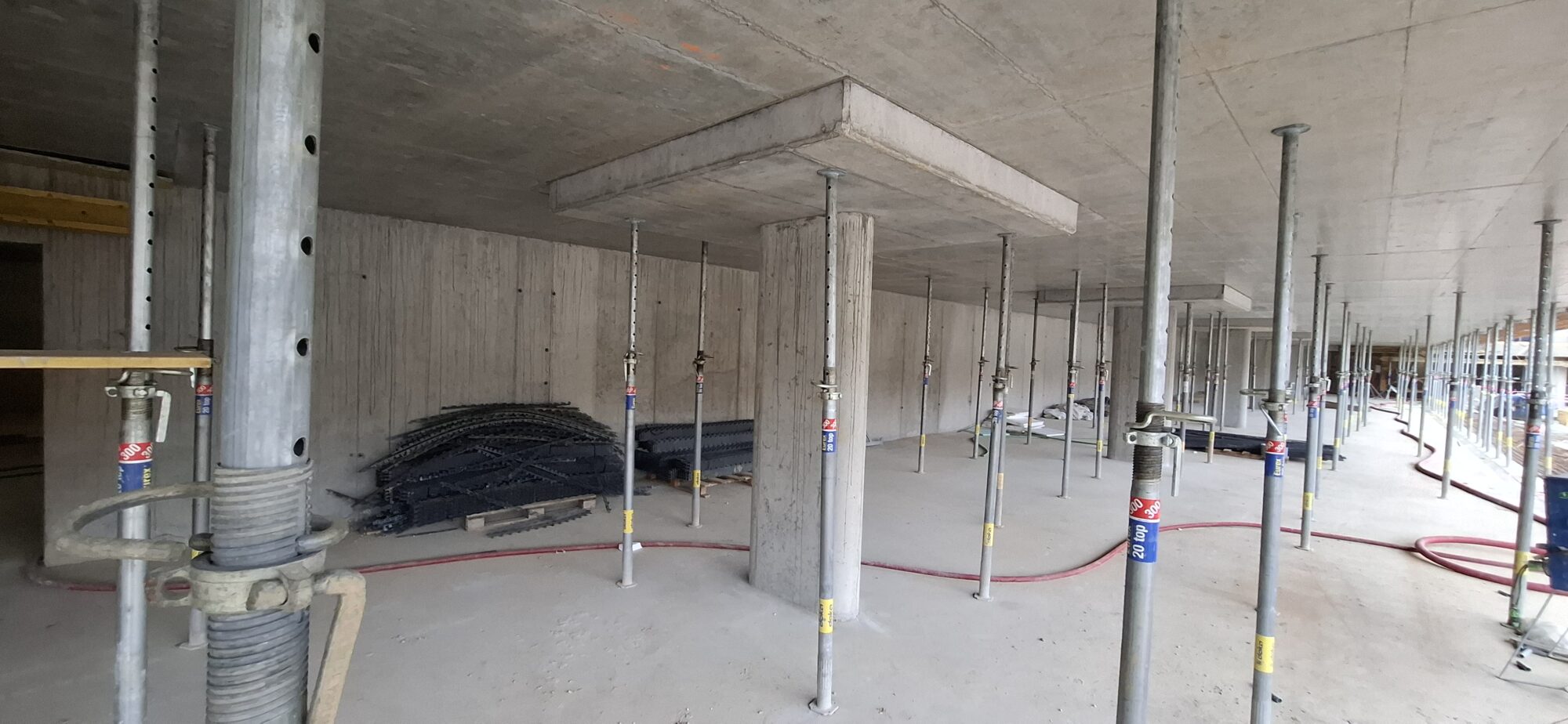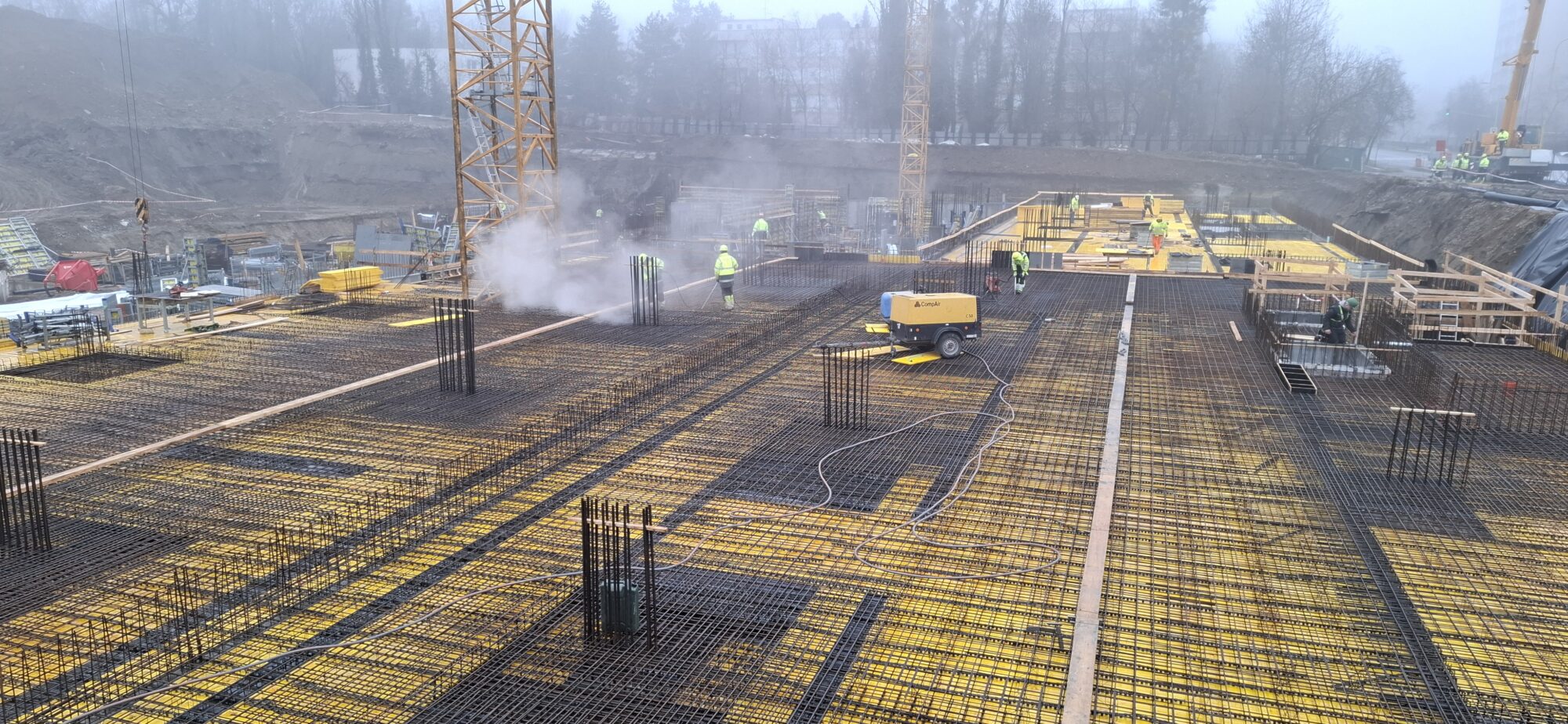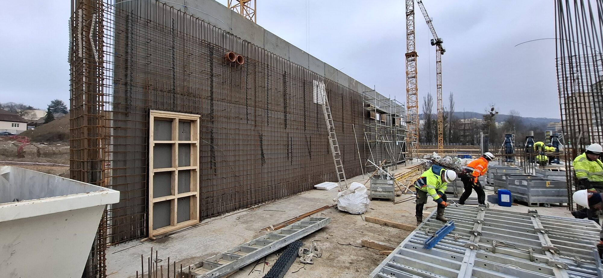 In Section A, concreting and reinforcement of the basement floor slabs are currently underway. On the lower levels, the gradual removal of slab formwork is in progress. In part of Section A, formwork and reinforcement works are also ongoing for the 5.2-metre-high walls of the first above-ground floor.