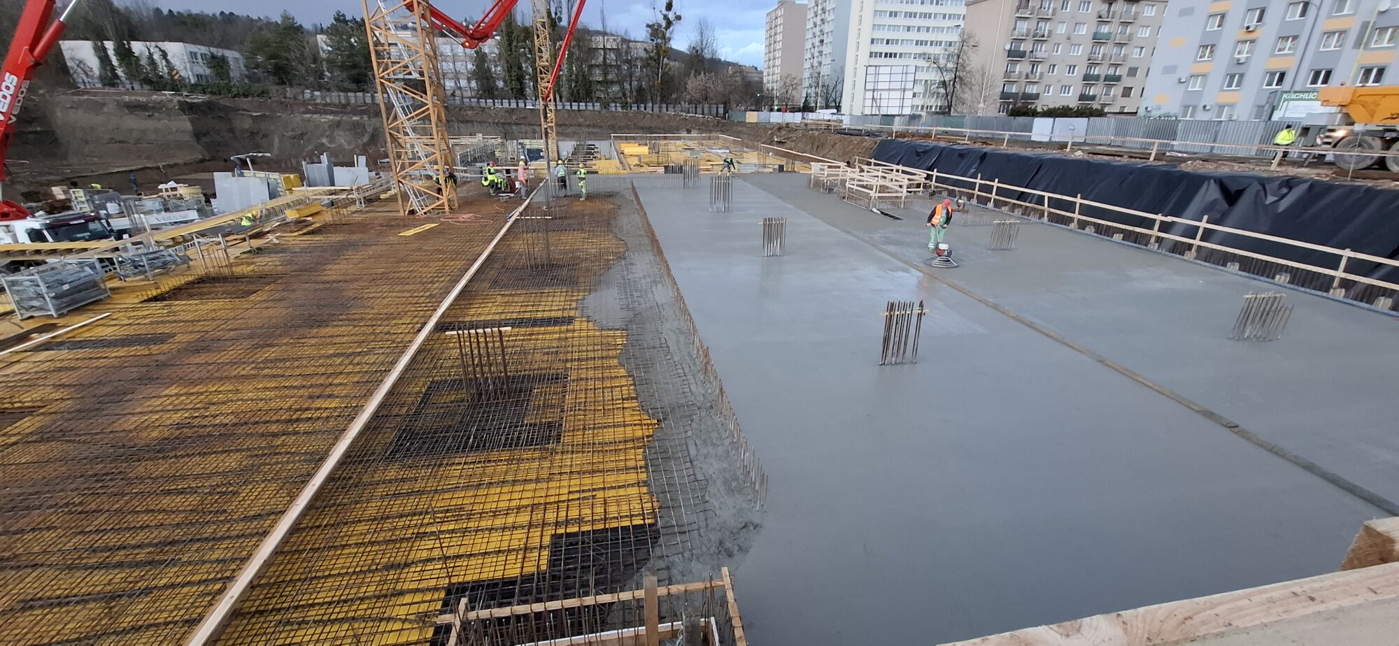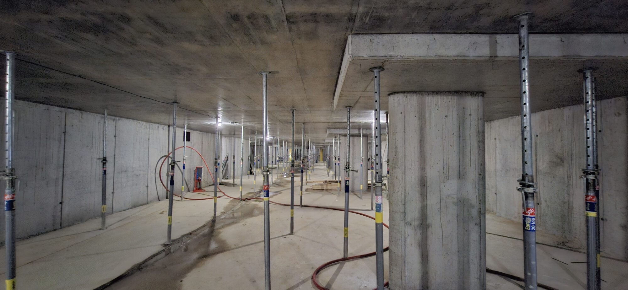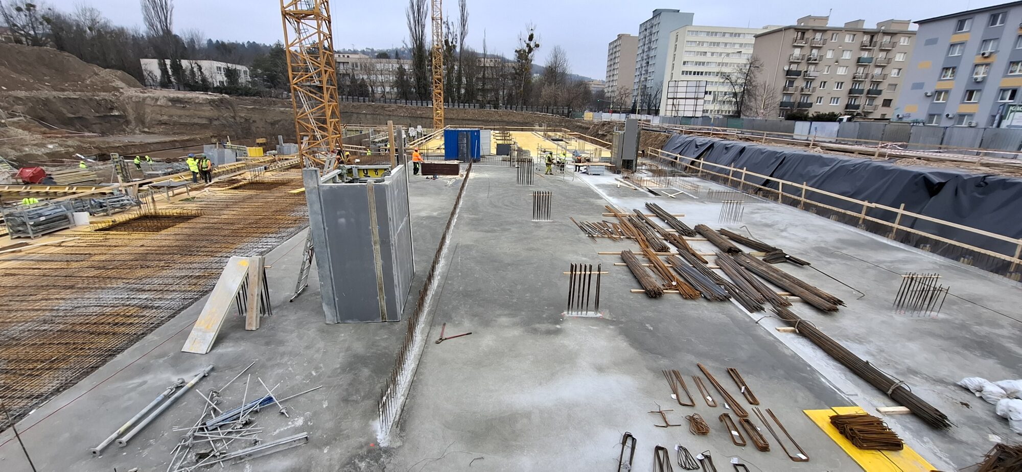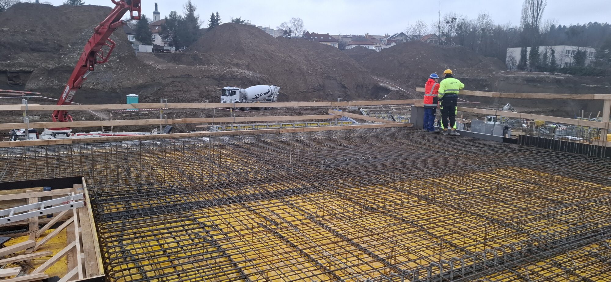 In Section A, concreting and reinforcement of the basement floor slabs are currently underway. On the lower levels, the gradual removal of slab formwork is in progress. In part of Section A, formwork and reinforcement works are also ongoing for the 5.2-metre-high walls of the first above-ground floor.