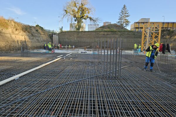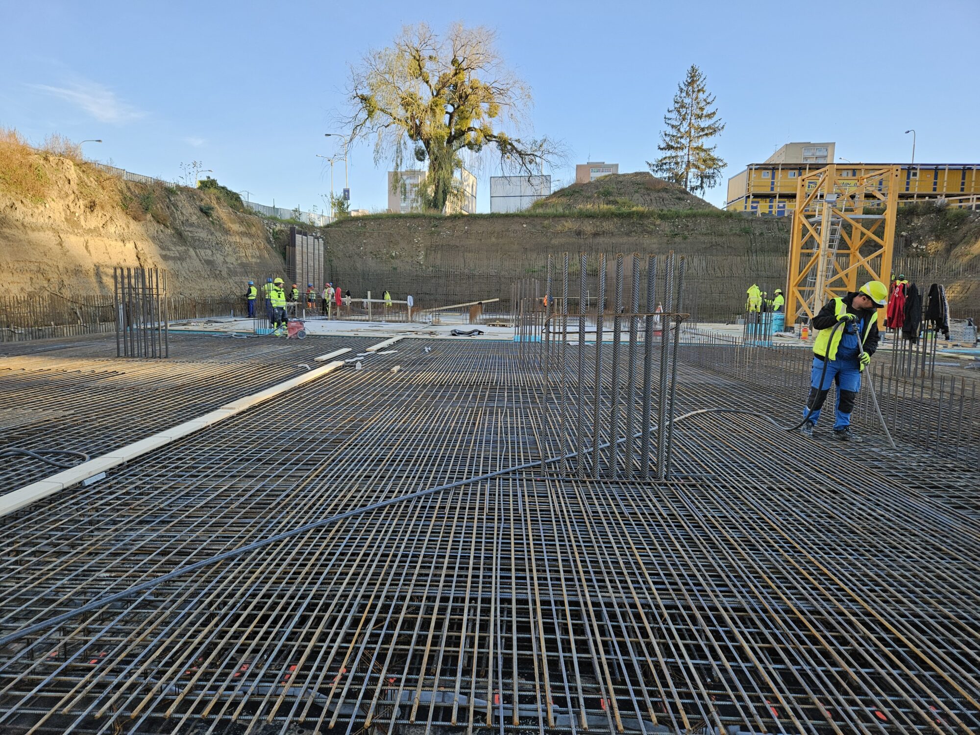 This month we successfully completed the demolition phase of the construction site. By removing the old foundations, we put a definitive end to the original buildings. At the same time, we have already started concreting the foundation slabs and the work is continuing at full speed. Three cranes are currently in operation, including our tallest one so far. With a height of 80 meters, you can see us from almost the entire city of Košice.